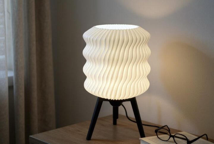 Transform your space with this captivating modern table lamp featuring a uniquely designed 3D printed shade with mesmerising wavy patterns.